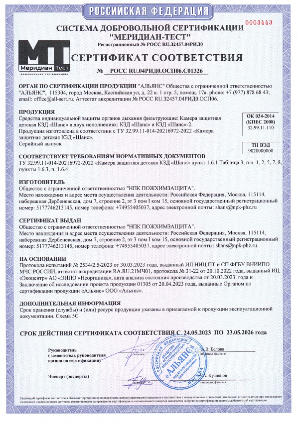 Камера защитная детская (КЗД) «Шанс» - средство защиты и спасения детей при пожаре, предназначенное для защиты детей до 1,5 лет от продуктов горения, термических факторов пожара, паров, газов и аэрозолей аварийно-химически опасных веществ ингаляционного действия, в том числе радиоактивных аэрозолей, при эвакуации на пожарах и техногенных авариях.