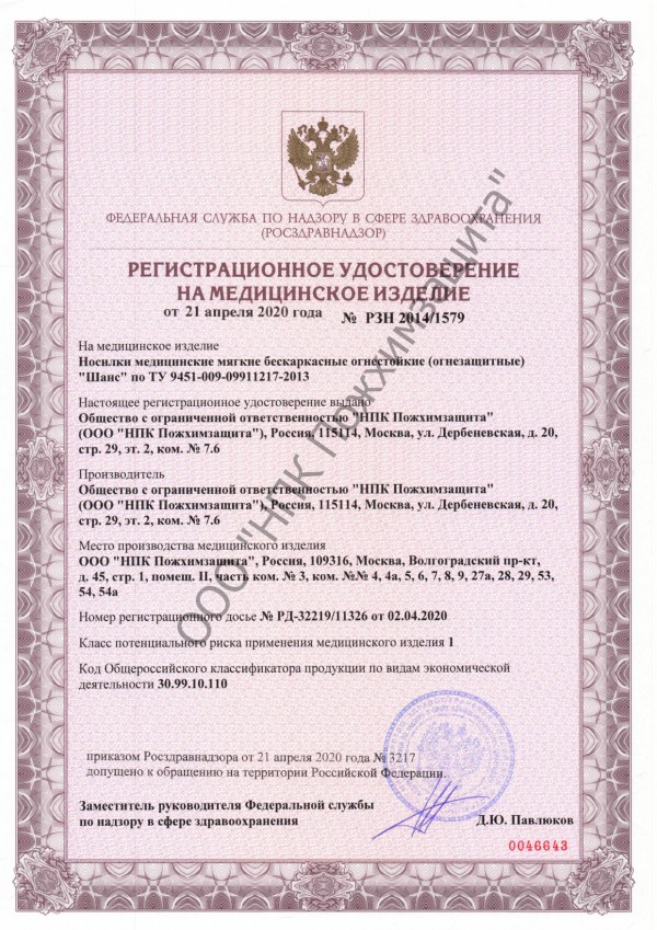 Носилки медицинские огнезащитные «Шанс» зарегистрированы как изделие медицинского назначения и предназначены для применения в учреждениях здравоохранения и социальной защиты в качестве резервного средства экстренной эвакуации пациентов, не имеющих возможность самостоятельного перемещения.