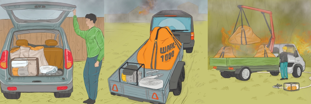Три цистерны «Шанс» (в сложенном виде) и мотопомпа помещаются в багажнике легкового автомобиля, что делает их доставку к месту пожара очень удобной.