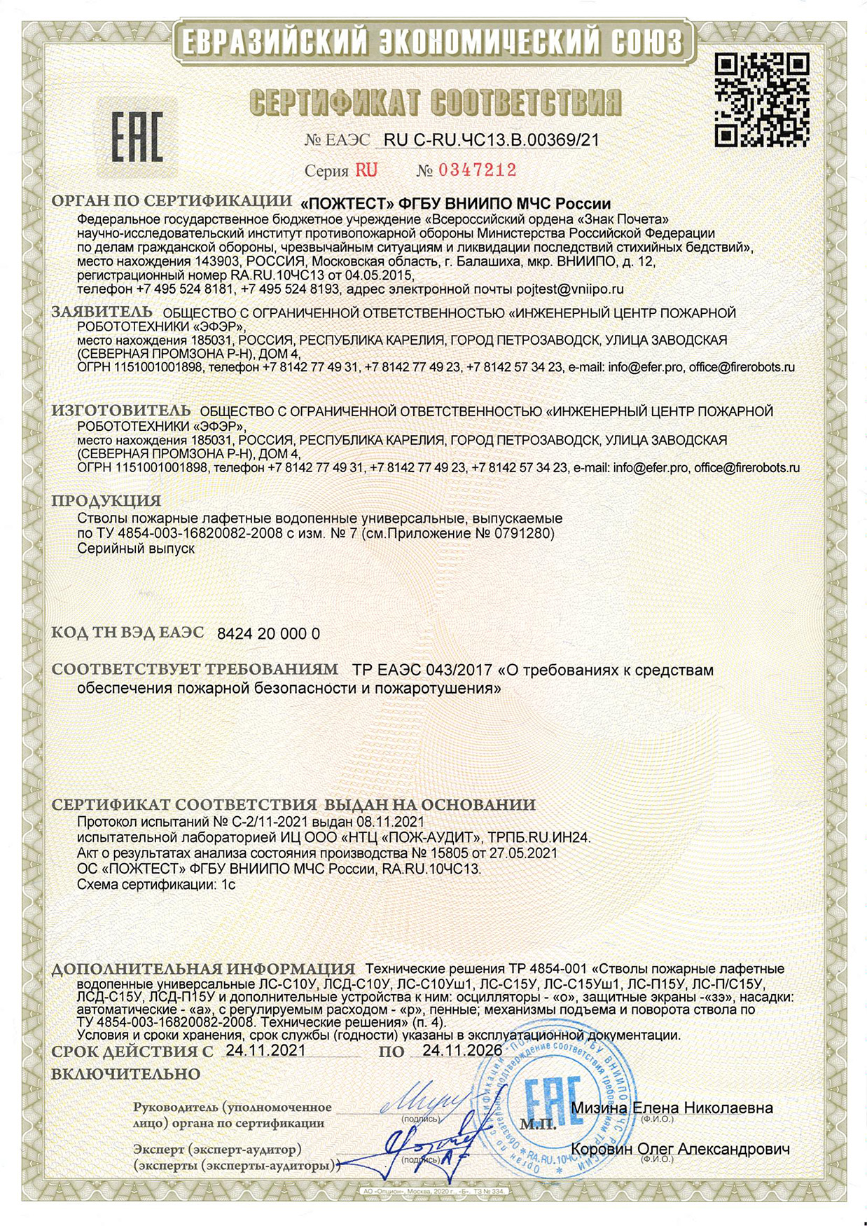 Ствол пожарный лафетный ЛСД-С20(15,25)У имеет сертификат соответствия на серийный выпуск по ТУ 4854-003-16820082-2008 с изменениями. Срок действия сертификата: с 24.11.2021 по 24.11.2026.