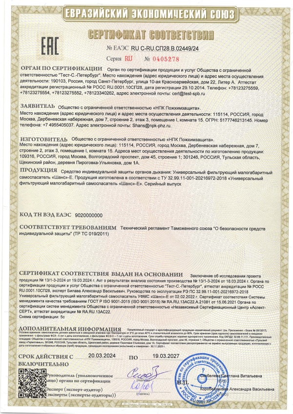 Самоспасатель (УФМС) «Шанс» -Е с полумаской (усиленная модель) - ТУ 32.99.11-001-20216972-2018