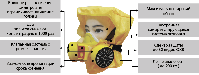 - Обеспечивает защиту органов дыхания, глаз и лица человека от продуктов горения и АХОВ на пожарах и чрезвычайных ситуациях.